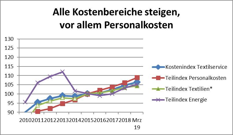 Die Kosten für Personal, Textilien und Energie des Textil Service stiegen 2018 um 3 Indexpunkte und von Ende 2017 bis März 2019 um 4 Indexpunkte. Im Vergleich zum Basisjahr 2010 lagen die Gesamtkosten des Textil Service im März 2019 um insgesamt 16 Indexpunkte höher.