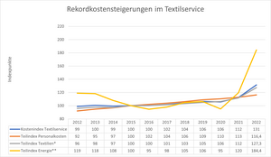 Die Kosten im Textilservice stiegen bereits 2021 mit 5,6 Prozent in einem Maße an, wie es die Branche seit vielen Jahren nicht kannte. Insbesondere die durch den Ukraine-Krieg massiv gestiegenen Energiepreise stellten diese Entwicklung 2022 jedoch nochmal in den Schatten.