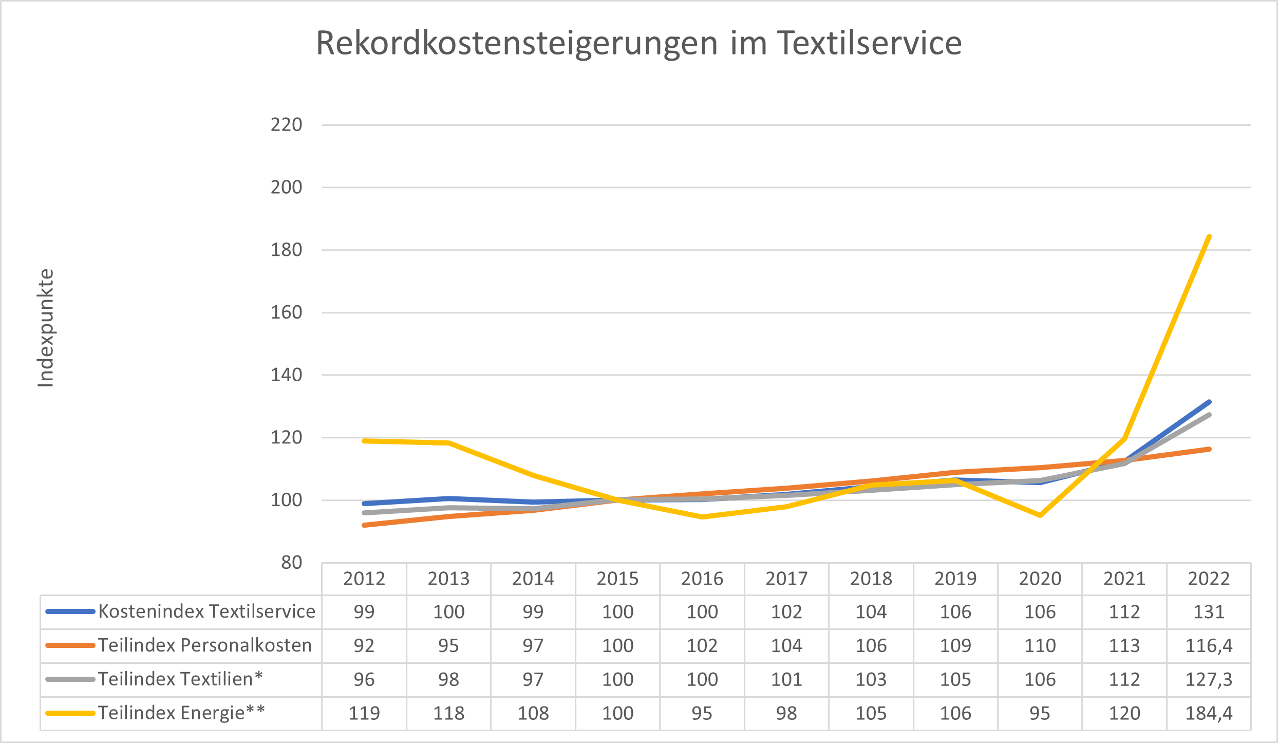 Berlin, 21.03.2023 – Das Jahr 2022 gehört zu den schwierigsten Jahren in der deutschen Wirtschaftsgeschichte. Pandemiefolgen, Krieg in der Ukraine, eine expansive Geldpolitik und gestörte Lieferketten führten zu sehr hohen Preis- und Kostensteigerungen für Wirtschaft und Gesellschaft. Der Kostenindex für den Textilservice stieg von 112 Punkten Ende 2021 auf 131 Punkte Ende 2022. Die 17 Prozent Kostenanstieg stellen die höchste Steigerung seit Einführung des Kostenindex dar.