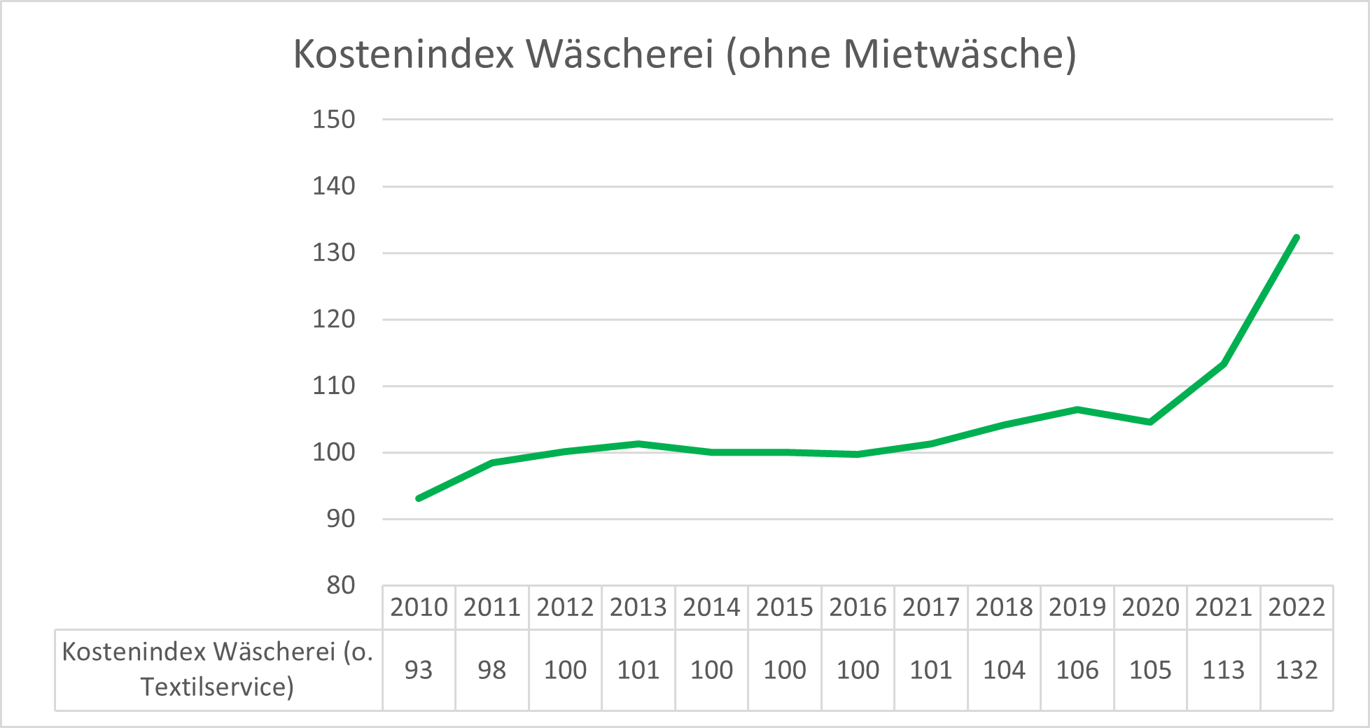 Besondere Erwähnung müssen die Kosten für die Waschchemie finden, die mit 36 Punkte stark gestiegen sind. Lagen sie Ende 2021 noch bei 107 Indexpunkten, so erreichten sie Ende 2022 143 Punkte. Zwar gehen die Chemiekosten nur zu 3 Prozent in den Index ein, gleichwohl zeigt er eine sehr branchenspezifische Teuerung, die erheblich jenseits der allgemeinen Teuerungsraten liegt.